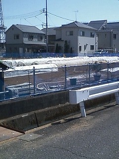 前方に大きな白い建物が見えます。水道局のポンプ施設です。